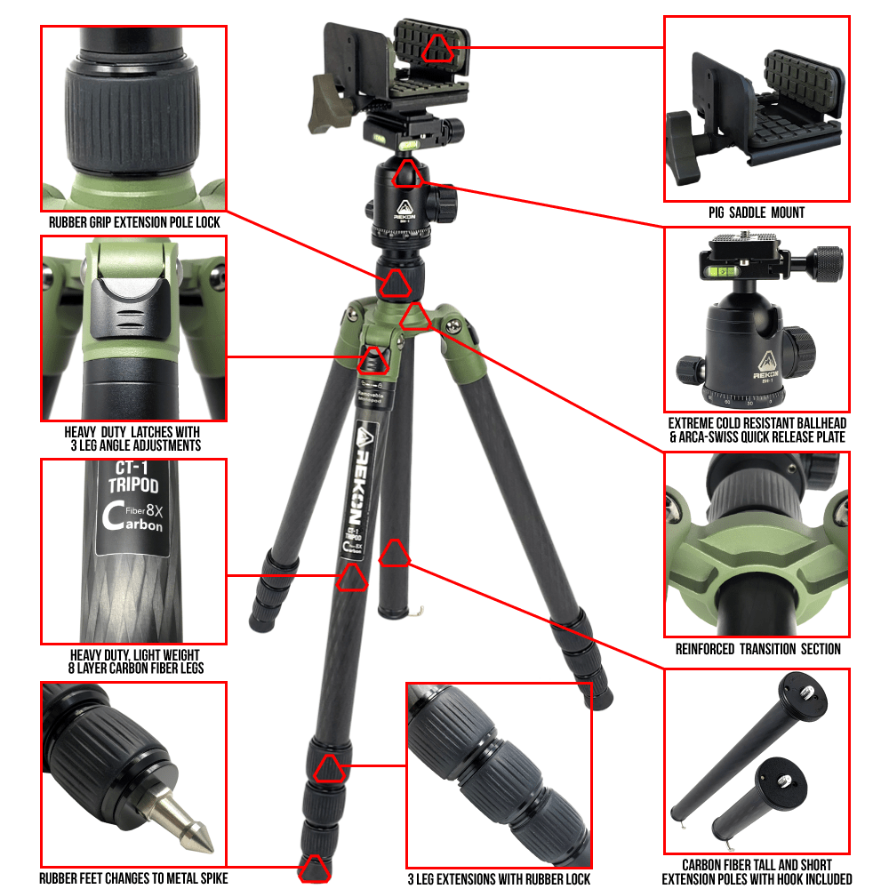 Der REKON CT-1 Zielstock ist nicht nur ein Stativ, es ist ein vielseitiges Hilfsmittel für alle Jäger und Schützen, die Wert auf Präzision und Qualität legen. Hergestellt aus hochwertiger Carbon-Kohlefaser, ist es extrem langlebig und gleichzeitig leicht. Mit dem BH1 Kugelkopf und der RTA1 Picatinny zu Arca-Schweizer Halterung bietet es Ihnen maximale Flexibilität und Anpassungsfähigkeit für jede Situation.