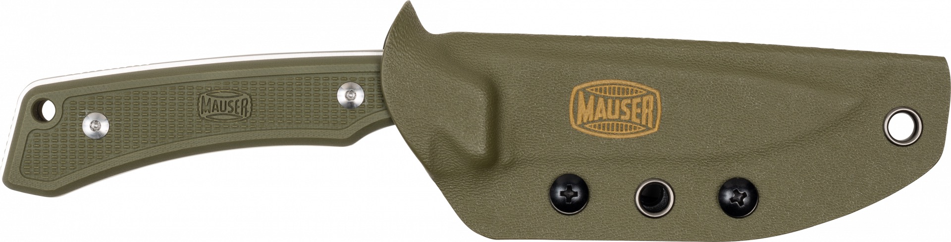 Das MAUSER Jagdmesser verfügt über eine feststehende Klinge mit einer Länge von 8 cm, gefertigt aus robustem D2-Stahl, der für seine lange Schnitthaltigkeit bekannt ist. Die Griffschalen bestehen aus widerstandsfähigem G10-Material und sind beidseitig mit dem MAUSER Logo geprägt. Inklusive Fangriemenöse am Messergriff und grüner Kydex-Messerscheide.